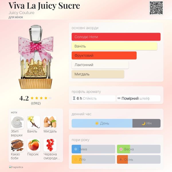 Viva La Juicy Sucre від Juicy Couture - це парфум для жінок, належить до групи ароматів Квіткові Фруктові Гурманські. Viva La Juicy Sucre був випущений в 2016. Верхні ноти: Червона Смородина, Мандарин і Гарденія; ноти серця: Мигдальний крем, Персик, Апельсиновий Цвіт і Жасмин; ноти бази: Збиті Вершки, Ваніль, Какао і Сандал.