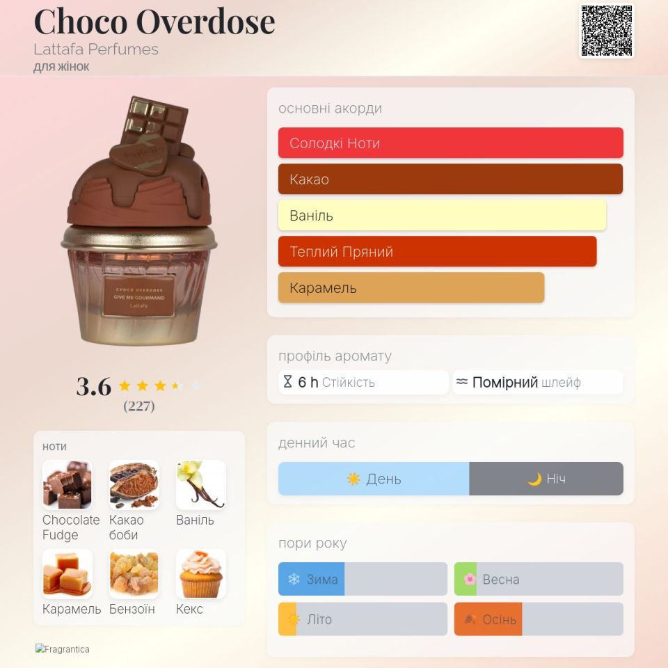 Choco Overdose від Lattafa Perfumes - це парфум для жінок, належить до групи ароматів Східні Ванільні. Це новий аромат. Choco Overdose був випущений в 2025. Верхня нота: Шоколадний фадж; ноти серця: Какао і Кекс; ноти бази: Ваніль, карамель і Бензоїн.