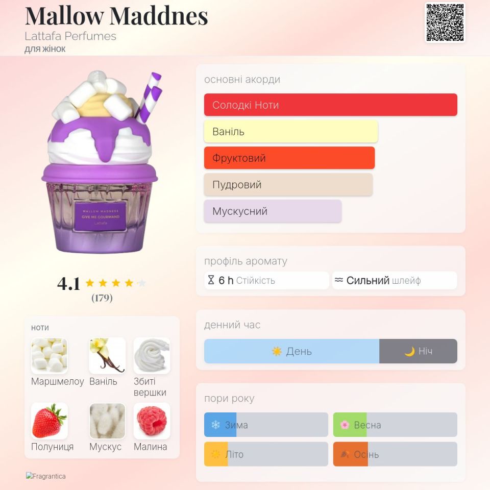 Mallow Maddnes від Lattafa Perfumes - це парфум для жінок, належить до групи ароматів Квіткові Фруктові Гурманські. Це новий аромат. Mallow Maddnes був випущений в 2025. Парфумер: Nanako Ogi. Верхні ноти: Полуниця і Малина; ноти серця: Маршмеллоу і Фрезія; ноти бази: Ваніль, Збиті Вершки і Мускус.