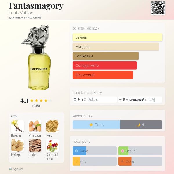 Fantasmagory від Louis Vuitton - це парфум для жінок та чоловіків, належить до групи ароматів Східні Ванільні. Це новий аромат. Fantasmagory був випущений в 2025. Парфумер: Jacques Cavallier Belletrud. Верхні ноти: Аніс і Імбир; ноти серця: Мигдаль і Квіткові Ноти; ноти бази: Ваніль і Шкіра.