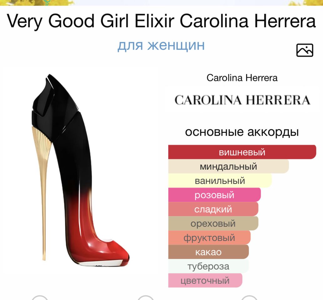 Еліксир дуже хорошої дівчиниКароліна Еррера це парфум для жінок, належить до східно-квіткової групи. Це нове видання: Еліксир дуже хорошої дівчини випущений в 2024 році. Верхні ноти: Чорна вишня і Гіркий Мигдаль; ноти серця: Троянда і Тубероза; ноти бази: Ваніль і Какао.