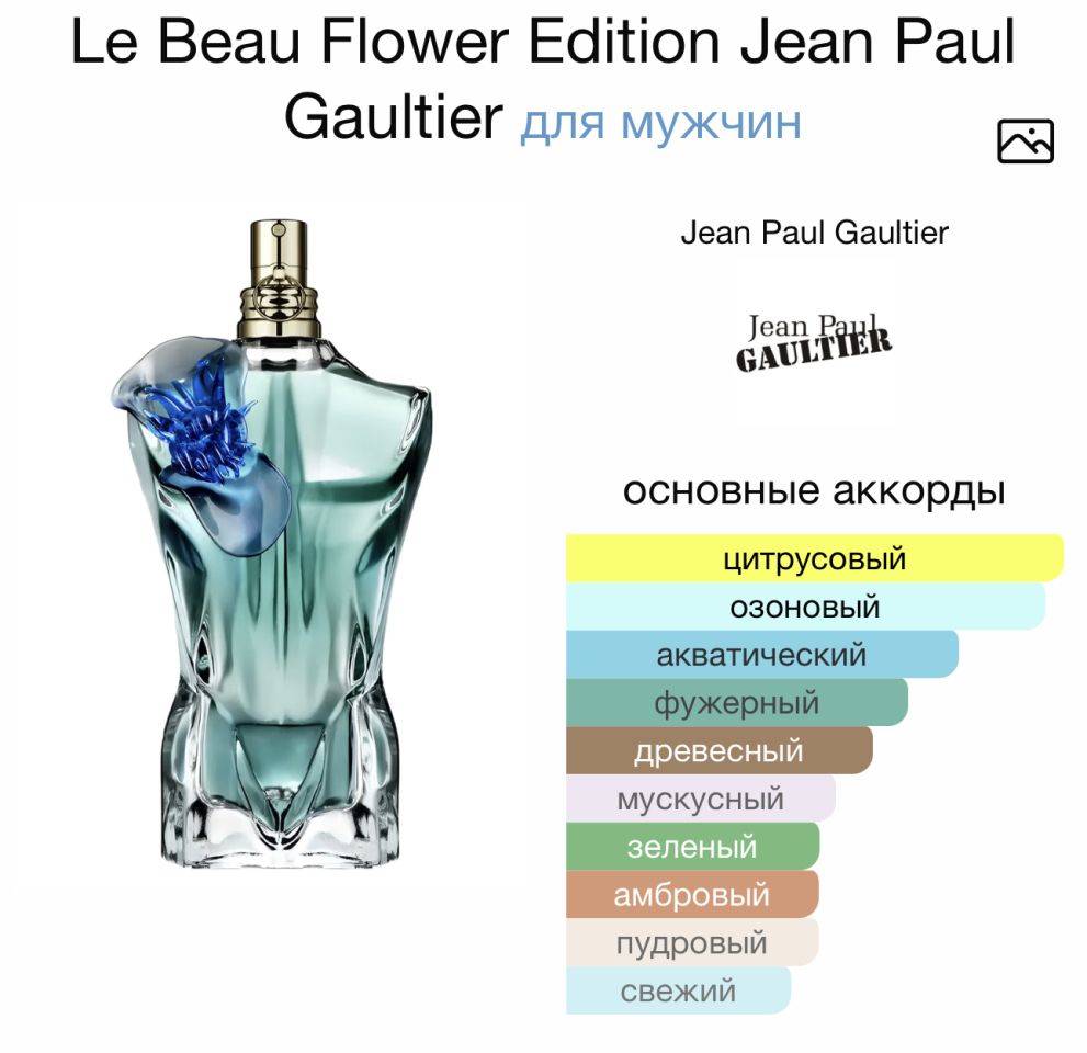 Квіткове видання Le BeauЖан Поль Готьє це парфум для чоловіків, належить до групи фруктових ароматів. Це нове видання: Квіткове видання Le Beau Le Beau Flower Edition був випущений в 2025. Парфумер: Quentin Bisch, Natalie Gracia-Cetto і Amelie Jacquin. Верхні ноти: Кумкват і Лимон; ноти серця: Лист Фіалки і Герань; ноти бази: Cashmeran, Боби Тонка і Пачулі.
