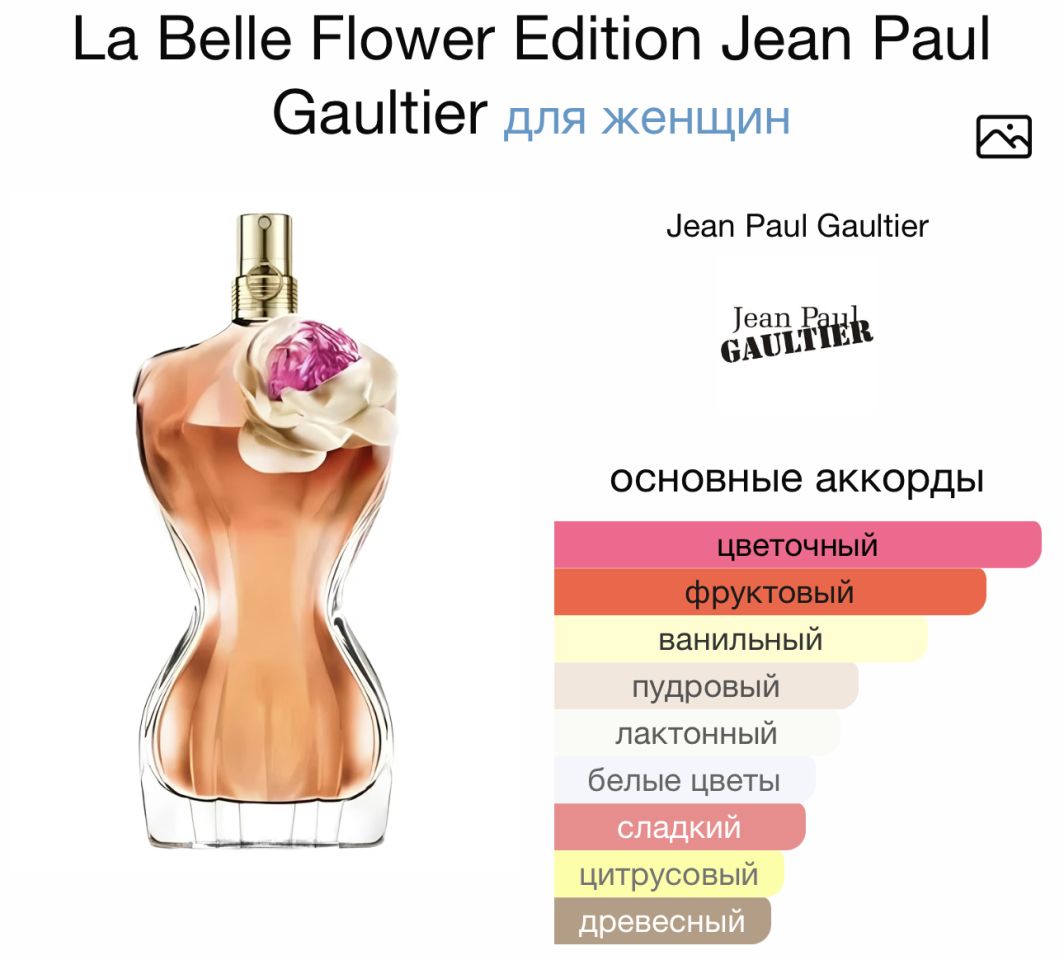 La Belle Flower EditionЖан Поль Готьє це парфум для жінок, належить до групи квітково-фруктових. Це нове видання: La Belle Flower Edition La Belle Flower Edition був випущений в 2025. Парфумер: Quentin Bisch, Natalie Gracia-Cetto і Amelie Jacquin. Верхня нота: Абрикос; ноти серця: Магнолія, Османтус і Жасмин; ноти бази: Ваніль, Ветивер і Пачулі.