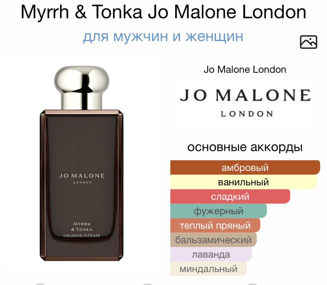 Мирра і тонкаДжо Мелоун Лондон це аромат для чоловіків і жінок, належить до східної групи. Мирра і тонка випущений в 2016. Парфумер: Mathilde Bijaoui. Верхня нота: лаванда; нота серця: Мирро; ноти бази: Боби Тонка, Ваніль і Мигдаль.