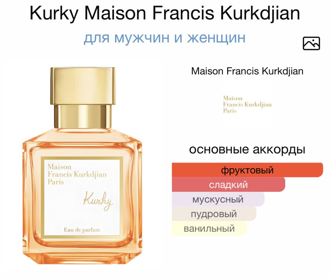 КуркиМезон Френсіс Куркджян це аромат для чоловіків і жінок, належить до групи квіткових фруктових ароматів. Це нове видання: Курки випущений у 2025 році. Парфумер: Francis Kurkdjian. Верхні ноти: Персик і Малина; ноти серця: Гуммі Цукерки і Фруктові Ноти; ноти бази: Білий Мускус і Ваніль.