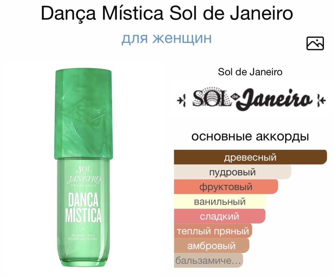 Dança MísticaСоль де Жанейро це парфум для жінок, належить до зелено-квіткової групи. Це нове видання: Dança Mística випущений в 2025 році. Верхні ноти: інжир і шампанське; ноти серця: Зелені Груші Анжу, Корінь Ірису і Конвалія; ноти бази: Сандал, Ваніль і Амбра.